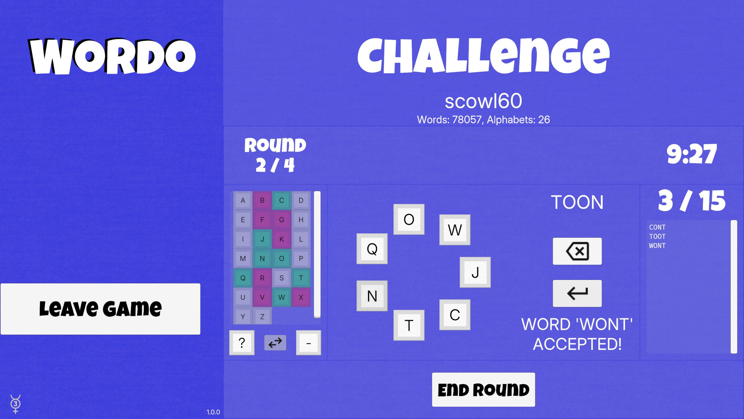 Wordo is a simple and engaging word game where you create words from a given set of letters. Test your vocabulary and quick thinking as you try to form as many valid words as possible.